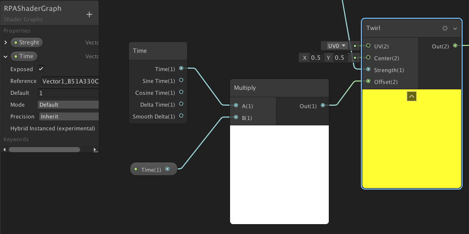 同理我们在创建一个“Verctor1”变量,然后创建一个“Multiply” 乘法节点,将其“Time”和"V1"相乘后,输出给“Twirl”的“Offset”输入: