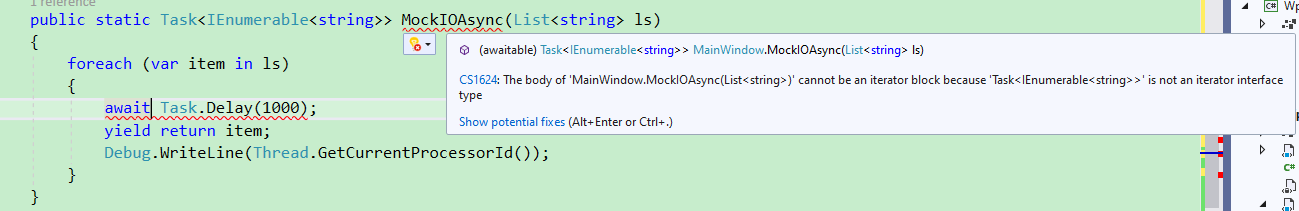 通过提示信息,我们可以发现,返回值 Task<IEnumerable<string>> 并不是可以迭代的,因为我们采用了 yield 来返回值,所以我们需要一个可以迭代的返回值。