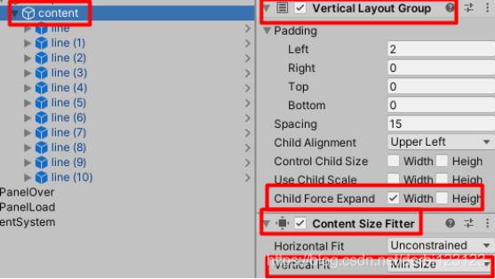 滚动条的滑动是每一行每一行形式的,所以给容器Content加水平布局组件和容器大小的自适应。