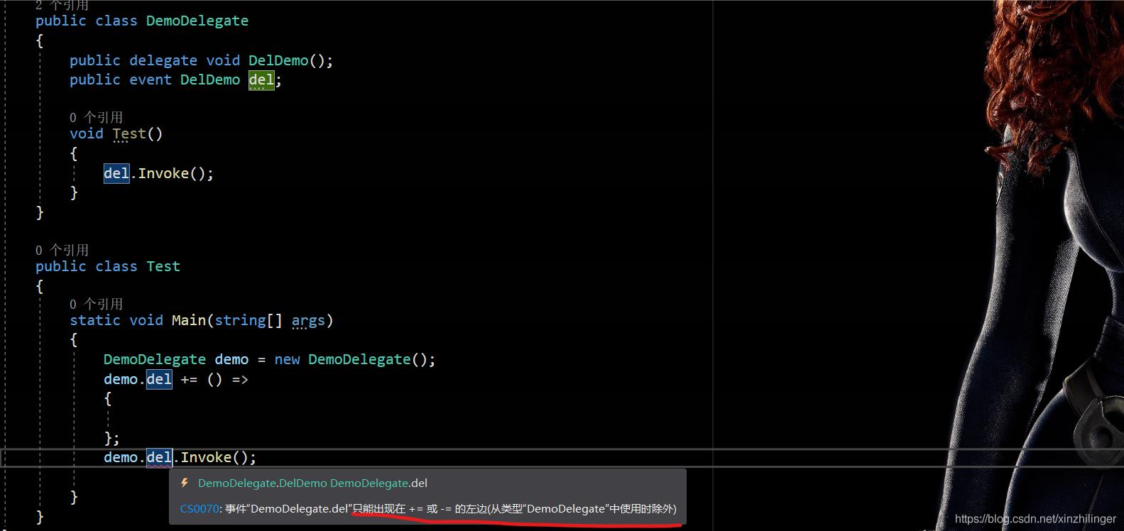 当然有一些语法是比较独特的,比如说+=这样的语法,就是一种为委托添加事件方法的方法,而对于执行委托语句demo.Del?.Invoke("你们好");中Invoke()为执行该委托对象内方法的API,?则可以在Del委托对象为空时,系统不报错