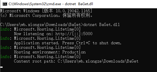 在BaGet.zip文件解压目录(BaGet文件目录)下打开命令行,执行:dotnet BaGet.dll