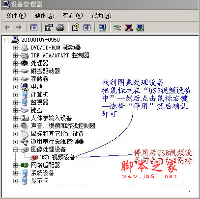其实最简单的是在设备管理里停用摄像头设备。其它两种方法不建议采用,原因是:当卸载掉电脑摄像头的驱动后如果以后要用的话,又要下载驱动或安装