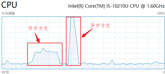 通过观察任务管理器,发现同步方式比较耗时间,异步方式比较耗资源【本例是CPU密集型操作】,属于以资源换性能。同步方式和异步方式的CPU利用率,如下图所示: