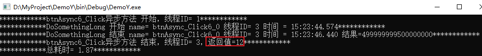 Console.WriteLine("************btnAsync6_Click异步方法 结束,线程ID= {0},返回值={1}************", Thread.CurrentThread.ManagedThreadId, result);