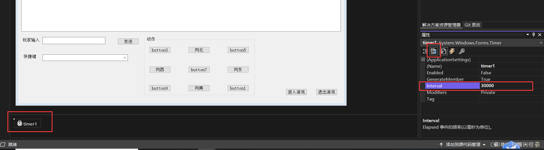 点击timer1,找到设置中的Interval,设置为30000,将Enable设为true。