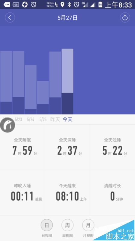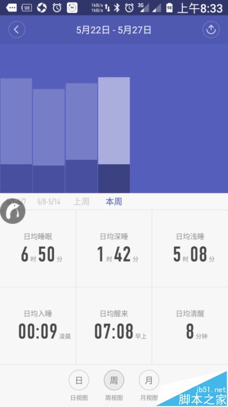 分为日视图、周视图、月视图,都是平均值的对比,通过观看历史数据,可以知道自己平时一般睡多长时间。