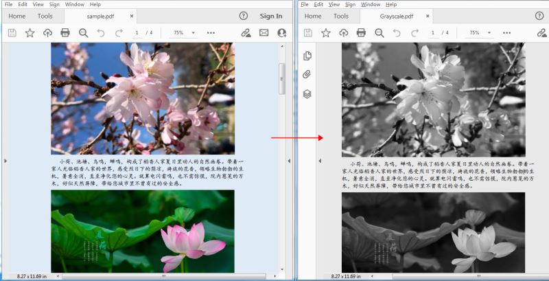本文以C#代码为例介绍如何实现将彩色PDF文件转为灰度(黑白)的PDF文件,即 将PDF文档里面的彩色图片或者文字等通过调用PdfGrayConverter.ToGrayPdf()方法转为文档页面为灰色调、无彩色效果的文档。下面的程序运行环境及代码示例。