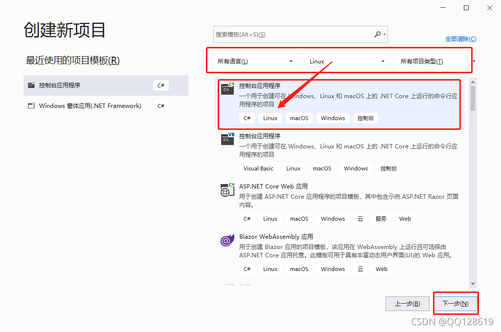如上图所示,选择linux开发平台,我用的VS2019,.Net5.0,一直点下一步,创建。