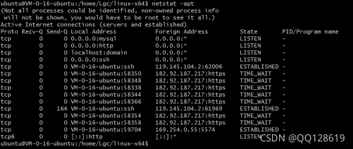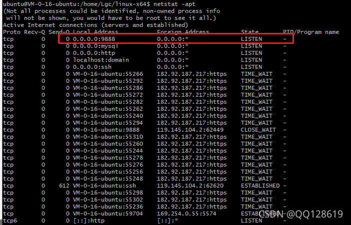 进入解压后的文件夹查看tcp使用情况,使用命令netstat -apt