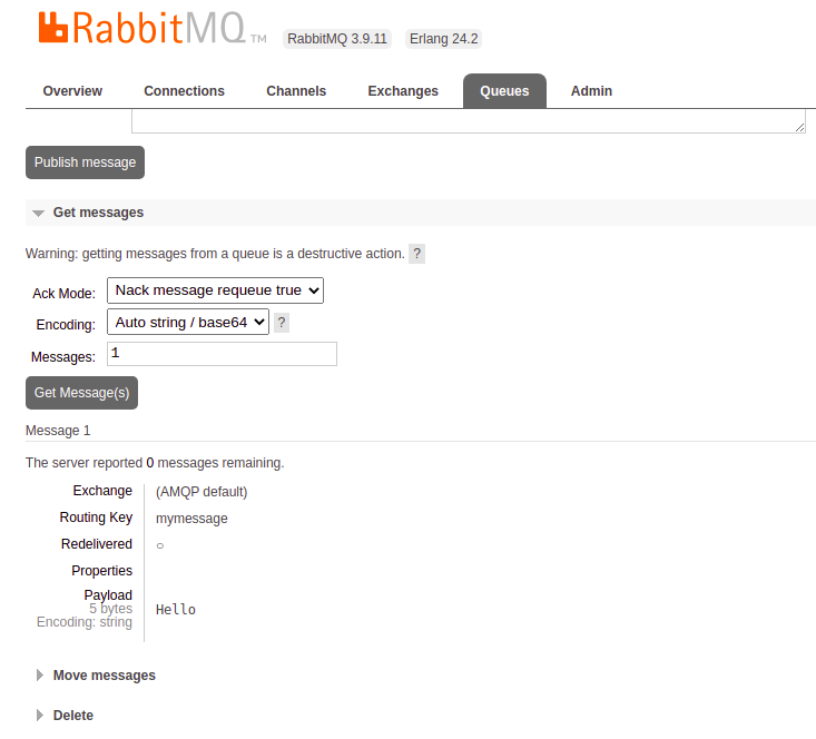 在Publish message中写一些消息并发送。回到控制台接收程序,消息应该已经被接收了。