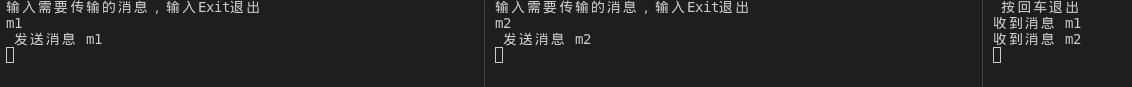 现在可以用这两个程序做一些测试,首先看一下一个发送端,两个接收端是什么情况: