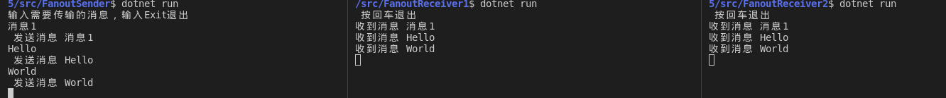 现在我们可以让发送和接收一起工作了,在两个终端分别启动发送和接收程序,看是否可以一起工作。
