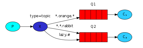 前面的Direct模式中,RouteKey是固定的,Topic模式引入了通配符,RouteKey可以是符合表达式的任何字符串。