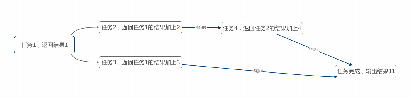 任务2和任务3要等待任务1完成后,取得任务1的结果,然后开始执行。任务4要等待任务2完成,取得其结果才能执行,最终任务3和任务4都完成了,合并结果,任务完成。图中已经说的很明白了。下面来看一下代码: