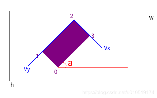 可获取RotatedRect四个端点的坐标。先选定一个点为输出Mat左上端点,这里采取的是离原图左上角最近的端点(即x2+y2最小)。然后再选取相邻的2个端点,作向量Vx及Vy。这里可以根据需求来选定Vx和Vy的方向,比如要求输出Mat的Width大于Height,那就选定长的一边为Vx。这里直接选定左上端点到顺时针方向的端点的向量为Vx,即如图所示。
