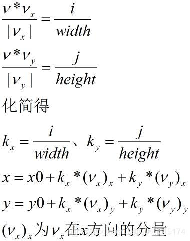在选定好Vx和Vy后,进行向量空间的变换。设在输出的Mat中任一一个坐标点(i,j),对应在输出Mat中的任一坐标点(x,y)。设左上端点坐标(x0,y0) (即图中点2),