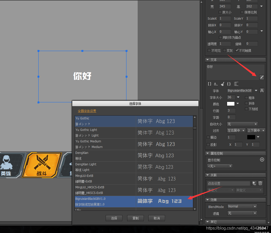 2.在fairygui里加个文本 选择字体 就能找到我们添加的字体了
