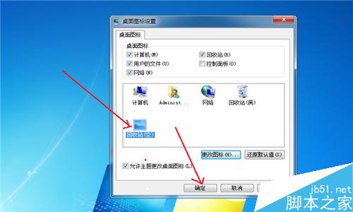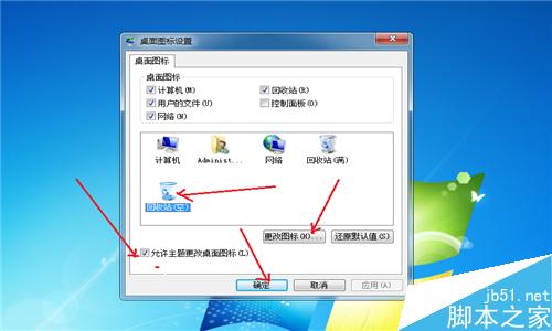 3、出现桌面图标设置,在允许更改桌面图标前的方框内,打对号,选择自己需要更改的桌面图标,比如更改”回收站“图标选中,单击确定。