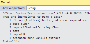Debug.WriteLine("What are ingredients to bake a cake?");