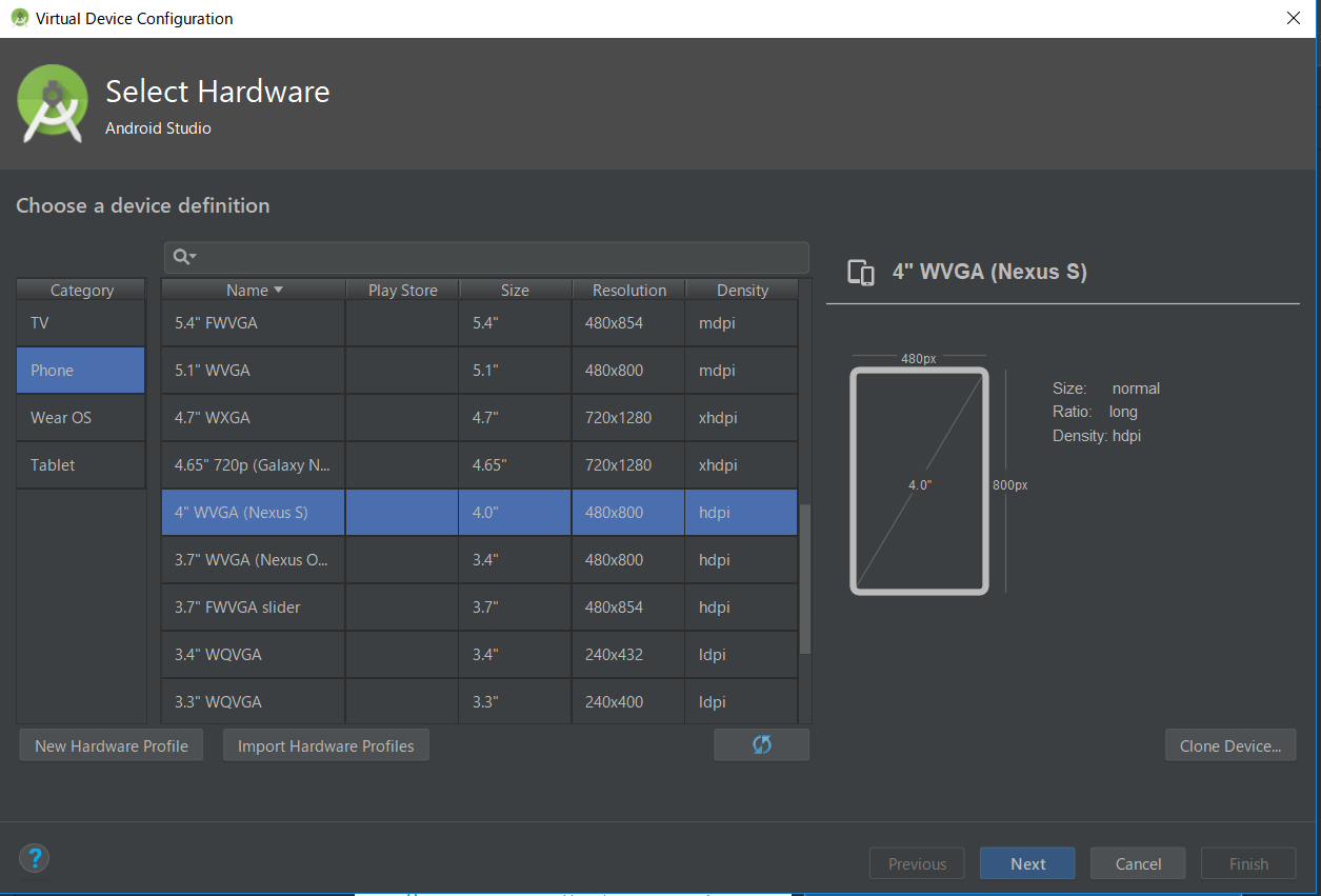 选择 phone ,找一个分辨率小一些的机型 例如 480X800 ,分辨率高了比较耗费资源。