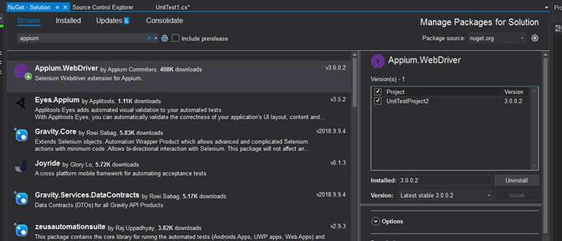 在 NuGet 中查找 Appium (Tools ->NuGet Package Manager -> Manage NuGet Package for Solution…)