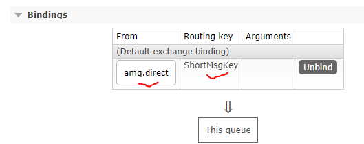 RabbitMQ是通过交换机将消息转发到对应队列,所以队列需要和交换机进行绑定。本例将队列绑定到默认的amq.direct交换机,并设置Routing key,如下图所示: