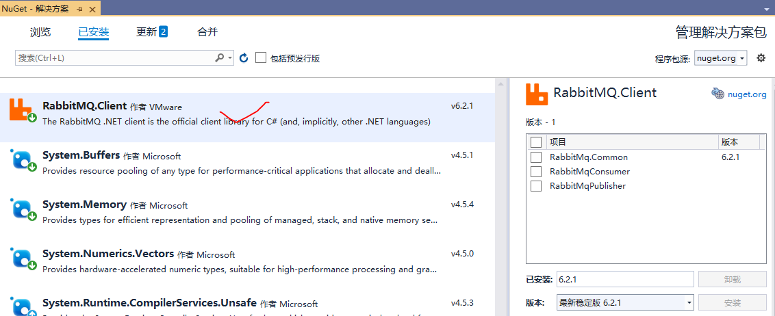 通过NuGet包管理器进行安装RabbitMQ.Client,如下所示: