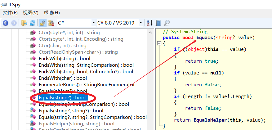 不管是==、还是Equals也好都是微软提供的public sealed class String密封类下面的提供的方法、看到此时还看不出其中的缘由、那么直接上反编译工具看一看究竟。