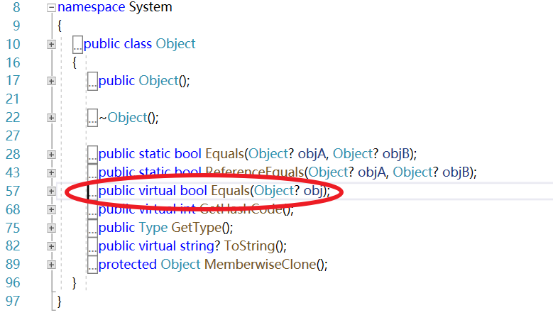二者都是输出False、由于不同的引用实例、所以引用的地址也是不同的、即使数值相同==也会返回False、可能有人会产生疑问,car1 和car2的内容是相同的啊,为什么他俩的比较结果却是为false呢?。原因就在于在Equals是Object中的一个虚方法,而Car类中没有对它进行重写,因此此时调用的仍是父类中的Equals方法。但是父类是无法知道你都有哪些成员字段的,因此返回的是false。要想让他能够比较两个变量的内容是否相同,那就应该重写Equals方法