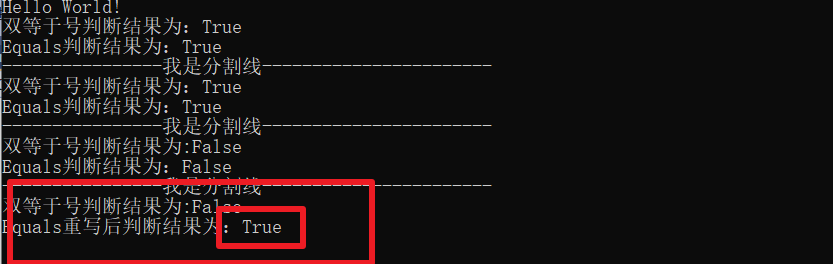 结果显示Equals重写后返回True、==引用的地址不同、所以还是返回False、由此可以证明重写后验证成功。
