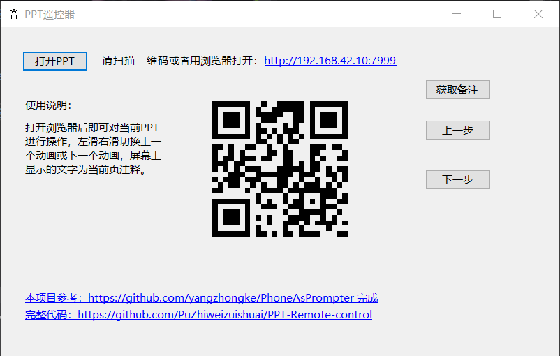 完整代码可以到 https://github.com/PuZhiweizuishuai/PPT-Remote-control 与 https://gitee.com/puzhiweizuishuai/PPT-Remote-control 查看。