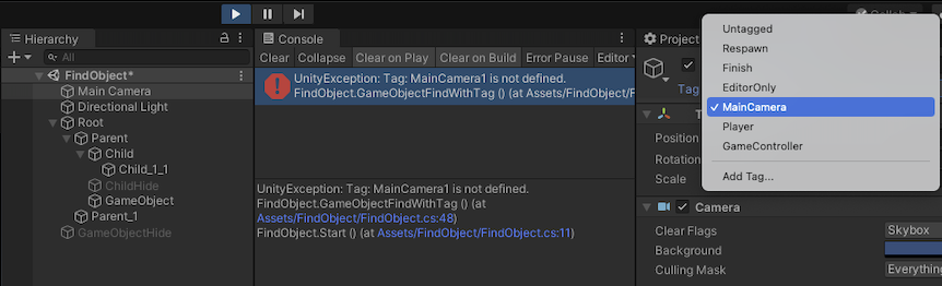 当有使用GameObject.Find("GameObject"), 场景中有多个名为“GameObject”的物体存在时,将每个“GameObject”设置为不同的标签,多运行几次查看结果。