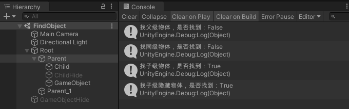 Debug.Log("找子级隐藏物体,是否找到:" + (childHide != null));