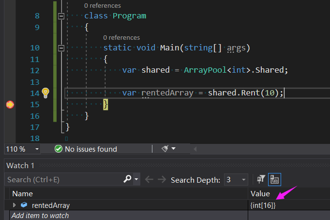 下面的代码展示了如何从 ArrayPool 中获取一个 size >= 10 的 array 数组。
