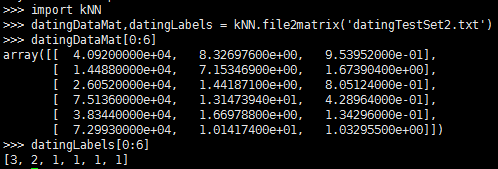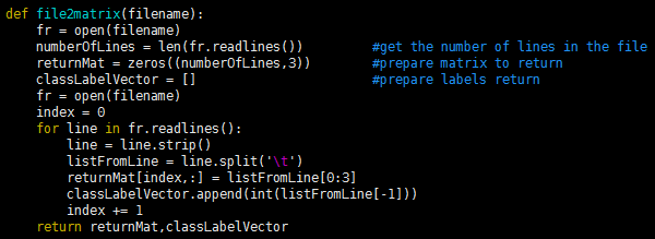 上述特征数据的格式经过file2matrix函数解析处理之后,可输出为矩阵和类标签向量。
