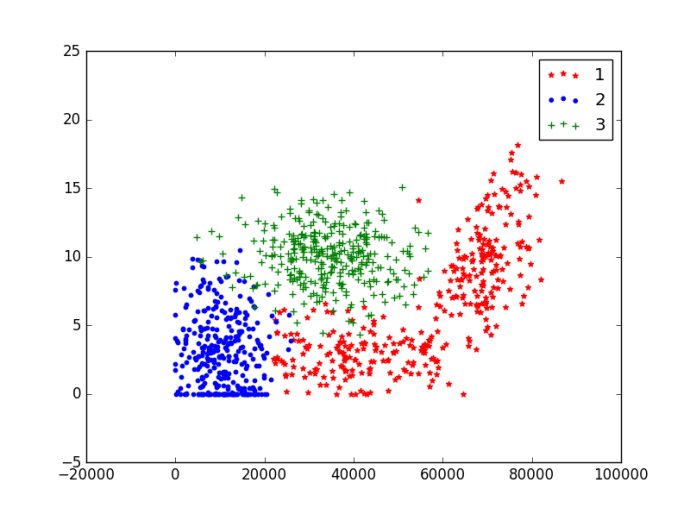 上图利用datingLabels存储的类标签属性,在散点图上绘制了色彩不等、尺寸不同的点。因而基本上可以从图中看到数据点所属三个样本分类的区域轮廓。为了得到更好的效果,采用datingDataMat矩阵的属性列1和2展示数据,并以红色的'*'表示类标签1、蓝色的'o'表示表示类标签2、绿色的'+'表示类标签3,修改参数如下: