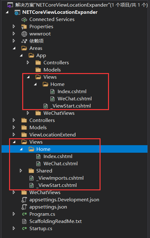 4、视图位置字符串(例如:“/Areas/{2}/WeChatViews/{1}/{0}.cshtml”)中的占位符含义:“{0}” 表示视图名称,“{1}” 表示控制器名称,“{2}” 表示区域名称。