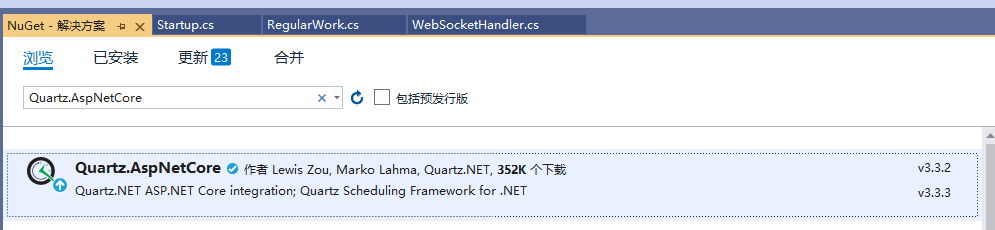 项目创建好后,我们需要在NuGet包管理器中安装Quartz.AspNetCore和Quartz.Extensions.DependencyInjection