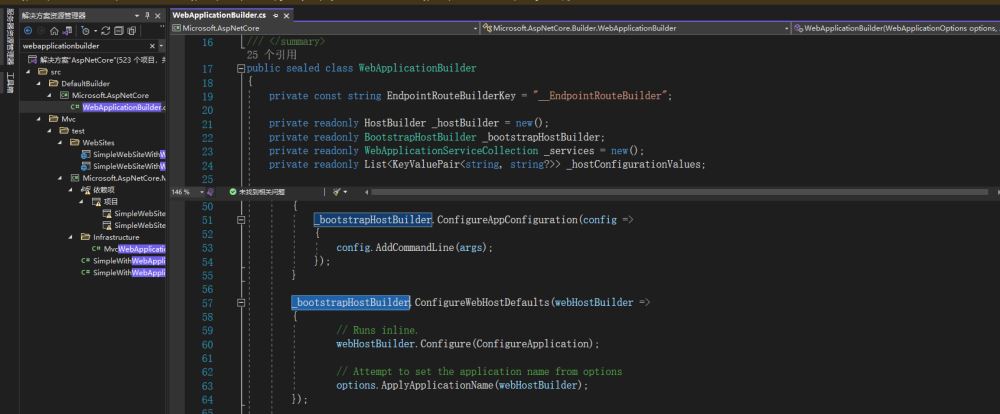 后面发现net6可以实现不需要startup文件,net6代码上图注释部分。net6的program改动挺大,而且起步是WebApplication。通过查看webapplication发现它的builder,webapplicationbuilder里面是通过bootstrapHostBuilder指定了ConfigureWebHostDefaults的调用。