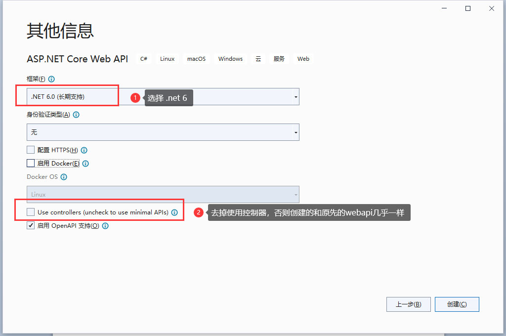 2、选择.net6版本,并且此处先去掉HTTPS配置以及去掉使用控制器的选项:
