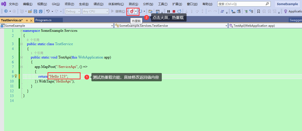 13、测试下VS2022热重载的功能,在返回值里面进行修改,然后点击热重载小火苗按钮进行热更新。