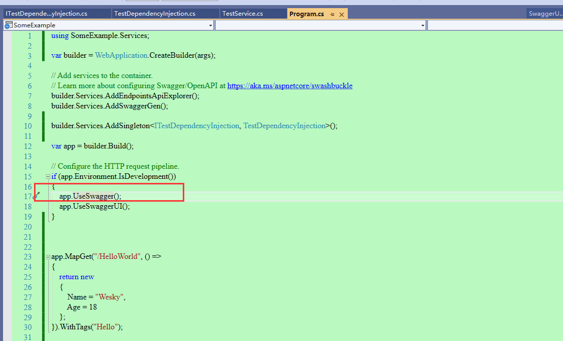 17、在program文件里面,对上面的服务进行注册。此处注册一个单例实例,具体代码如下图展示。