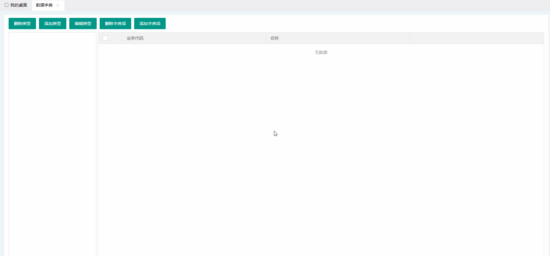 3、完成控制器层调用及页面中对数据字典的管理,对于字典信息而言,足够在界面中一览全貌,因此页面设计时,直接以树形结构加表格展示即可,左侧数据类型树形结构,右侧相应的数据类型项表格。