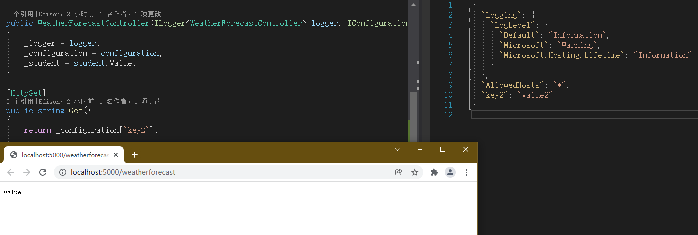 函数就可以实例化IConfiguration对象进行配置的读取。下面我们试一下运行的效果,在appsetting.json添加一个配置项,在action中可以进行访问。