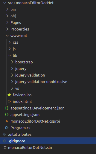 我们需要的文件在node_modules/monaco-editor/min/vs目录中,将整个vs目录拷贝到Asp.Net Core Web项目的wwwroot/lib目录下: