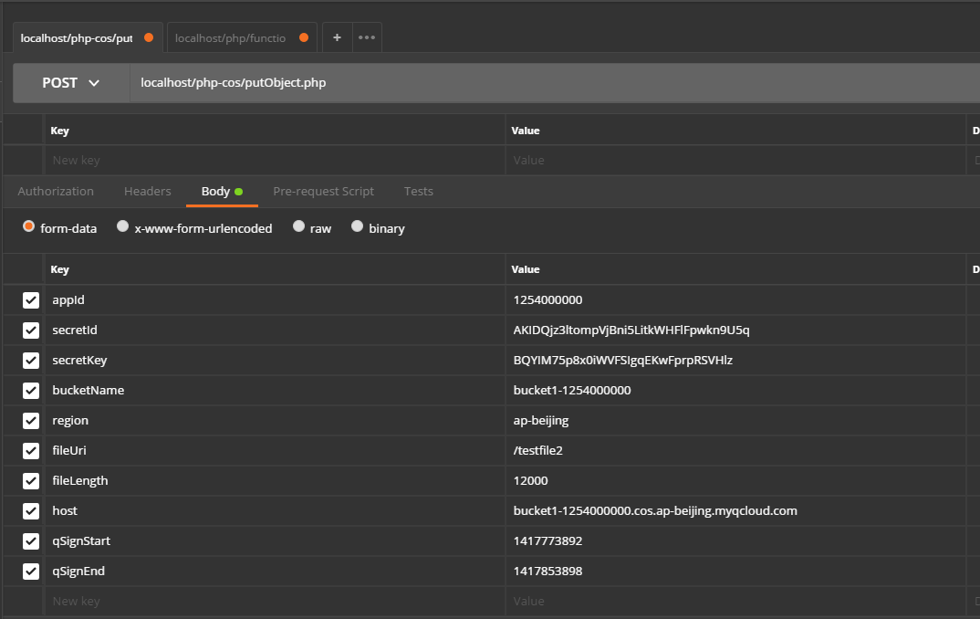 * secretId、secretKey 为必需参数,qSignStart、qSignEnd为调试需要,测试通过后应取消,改为方法内自动创建