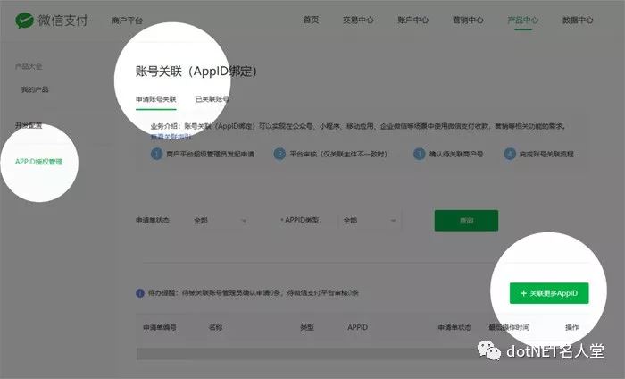 1、登录商户后台https://pay.weixin.qq.com,进入产品中心—APPID授权管理,进入授权页面如图:
