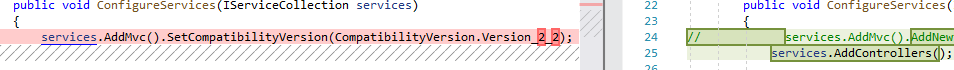 services.AddMvc().SetCompatibilityVersion(CompatibilityVersion.Version_2_2); 改为 services.AddControllers()(WebApi) / services.AddControllersWithViews();(MVC)