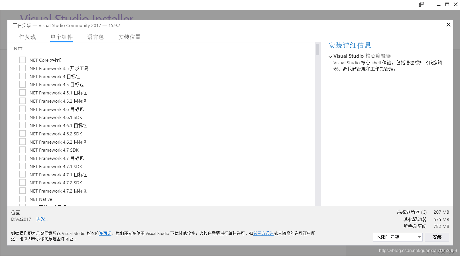 工作负载根据自己的需要选择,工作负载的选择会占用存储空间。也可以在安装好VS2017后,在对应的功能中下载。