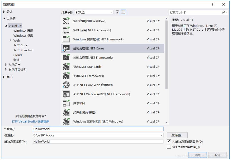 选择项目类型(以C#控制台为例)并根据需要修改项目名称和位置。